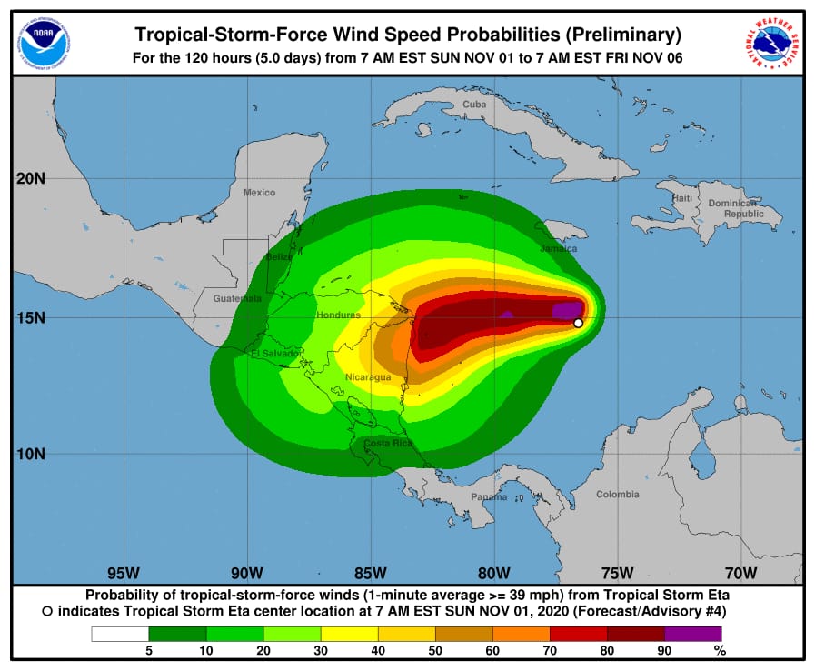El ojo de la tormenta tropical ETA según su ruta puede impactar directamente en los cayos del norte, sobre todo Serrana y Serranilla. El fenómeno tropical en horas de la noche de este domingo, podría fortalecerse y convertirse en huracán, por lo que se recomienda a todas las embarcaciones que se encuentren en el cono de incidencia de la tormenta tropical mantenerse alejada de la misma.