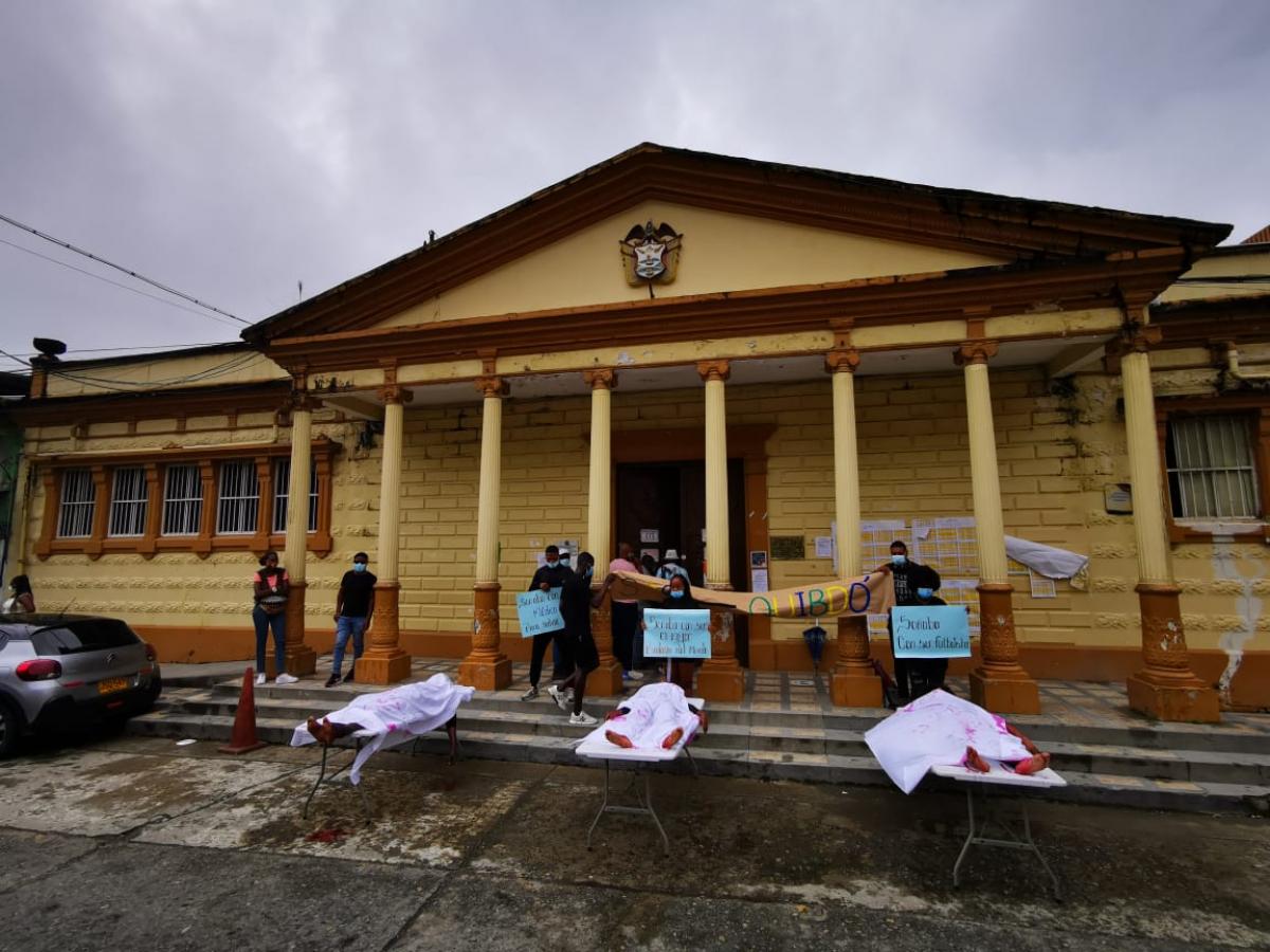 Esta mañana, los transeúntes de la carrera segunda en Quibdó se vieron sorprendidos con una imagen fuerte en todo el frente de la Alcaldía Municipal. Jóvenes realizaron una intervención artística para hacer un llamado sobre la violencia que vive la ciudad.