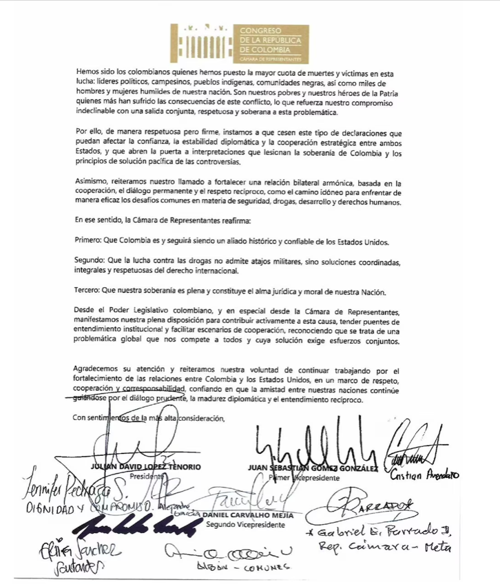 La carta, suscrita por López y siete congresistas de distintas colectividades, recuerda que el vínculo entre Colombia y Estados Unidos se ha sostenido sobre principios de cooperación, corresponsabilidad y diálogo en la lucha contra el narcotráfico. Bajo ese marco, advierten que cualquier insinuación de acciones militares contradice el derecho internacional y los criterios que históricamente han guiado la alianza entre ambas naciones.