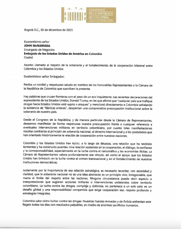 En una comunicación dirigida al encargado de negocios de EE. UU. en Bogotá, John McNamara, el presidente de la Cámara de Representantes, Julián López, expresó su “profunda preocupación” por cualquier alusión a intervenciones militares en territorio colombiano, señalando que este tipo de discursos afectan la estabilidad de una relación bilateral construida durante décadas.