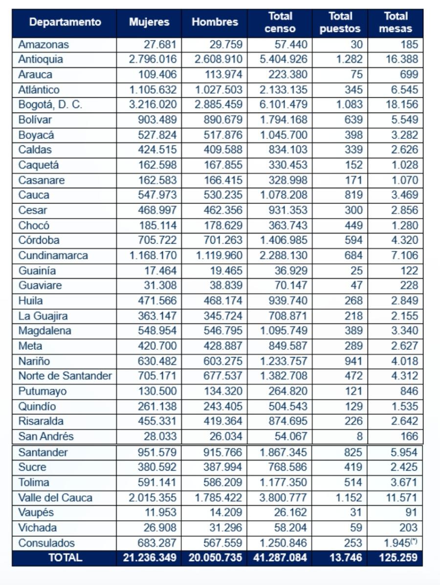 El potencial electoral está conformado por 21.236.349 mujeres y 20.050.735 hombres, quienes podrán ejercer su derecho al voto en 125.259 mesas distribuidas en 13.746 puestos de votación en todo el país y fuera de él.