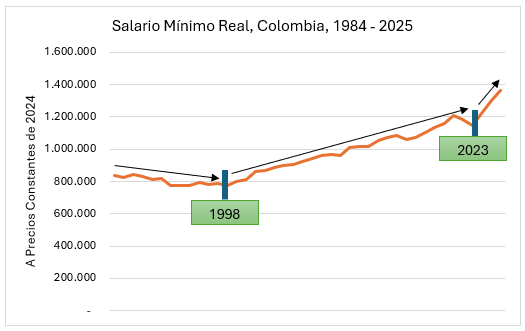 Tras estos hechos, se observa que la tendencia creciente del salario mínimo real (SMR) se acelera desde el inicio del gobierno de Petro, reflejando un mayor aumento del poder adquisitivo de los trabajadores y cumpliendo los dos objetivos de esta política: mejor bienestar social y mayor dinamismo económico.