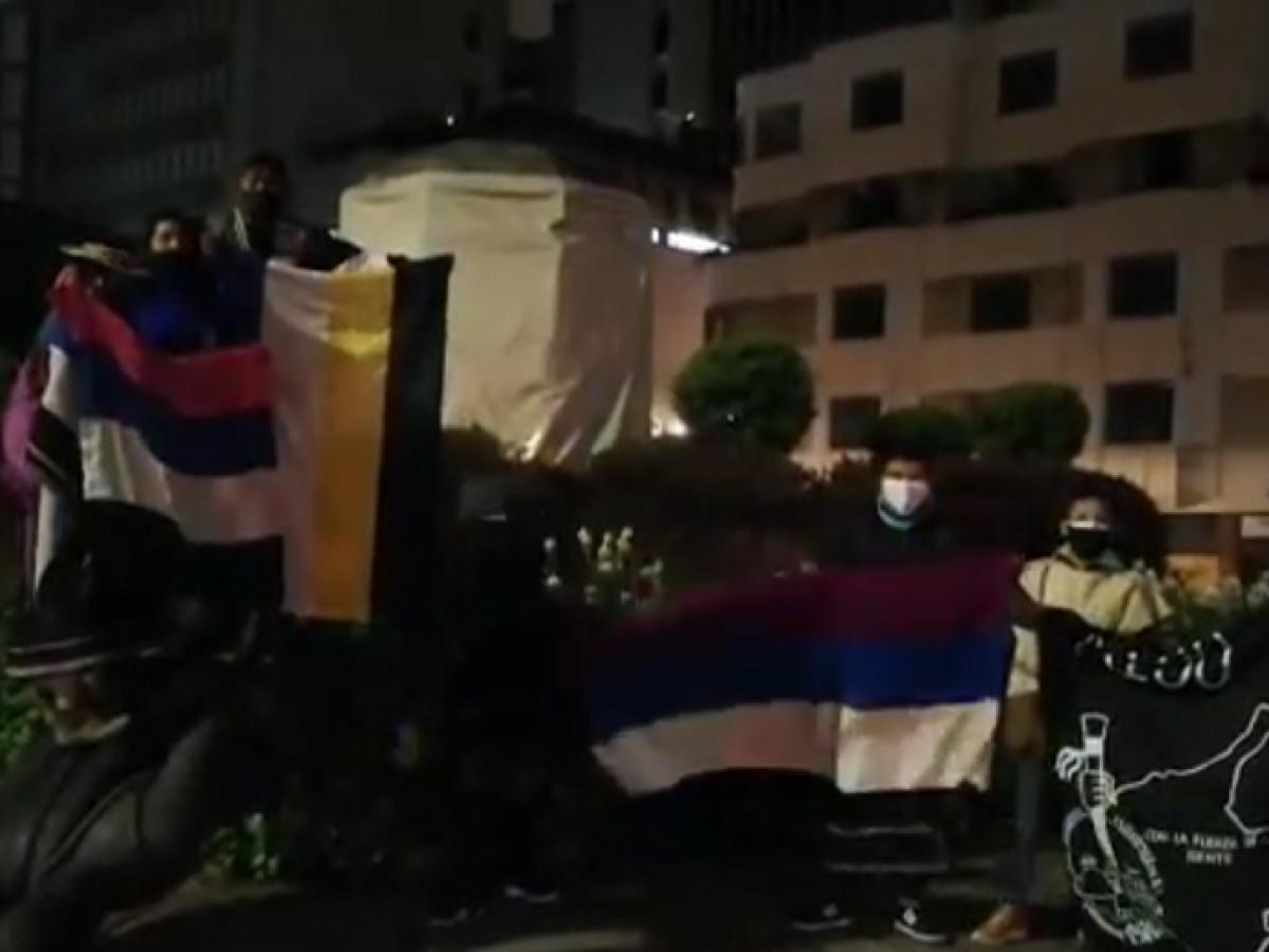 Indígenas Misak derribaron estatua de Gonzalo Jiménez de Quesada en Bogotá