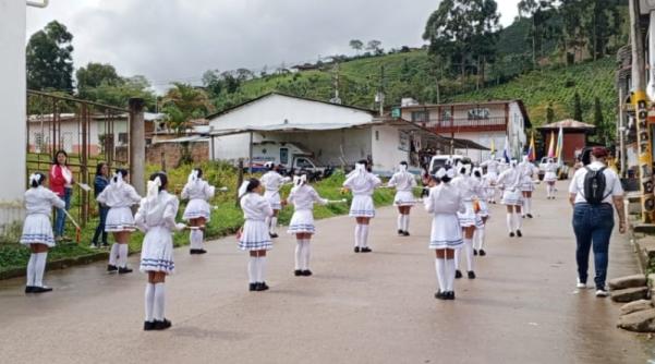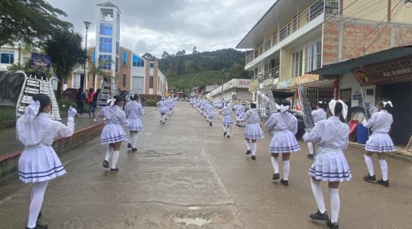 Muy temprano empezaron a prepararse los líderes y lideresas, firmantes de paz, así como familias víctimas en esta comunidad, para este acto de memoria que comenzó con un desfile desde el colegio local, amenizado por la banda de paz de San Marcos, un caserío cercano. Con consignas de paz decenas de personas acompañaron este recorrido que terminó en el parque principal bajo la lluvia.