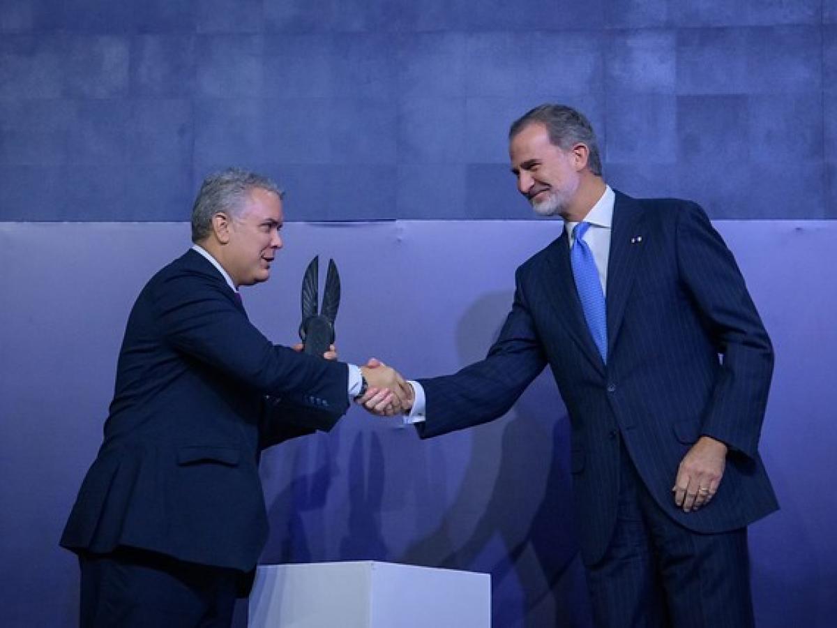 “En esta ocasión, este alto galardón ha recaído en una realidad colectiva e institucional, la Democracia colombiana, y lo recoge en este acto, en su nombre y representación, el presidente Iván Duque Márquez. La democracia colombiana, que se ha mantenido con firmeza pese a los muchos riesgos a los que ha tenido que hacer frente durante tantos años, va a sentirse reconocida, confortada y alentada, estoy seguro por esta importante distinción”, indicó.