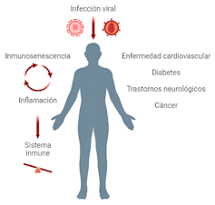 También se ha observado que los virus pueden acelerar los procesos de envejecimiento del sistema inmune (inmunosenescencia), donde hay una acumulación progresiva de células envejecidas que no son capaces de cumplir correctamente su función inmune.