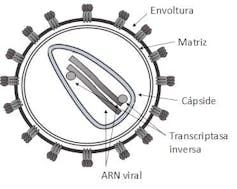 El VIH tiene una envoltura externa que protege su interior, donde se encuentran los elementos esenciales para que el virus pueda infectar y replicarse dentro de las células humanas. Entre ellos está la cápside, una estructura con forma de cono formada fundamentalmente por proteínas, como la p24. La cápside no solo protege el material genético del virus (su ARN), sino que también envuelve las enzimas virales necesarias para replicarse, como la transcriptasa inversa, integrasa y proteasa.