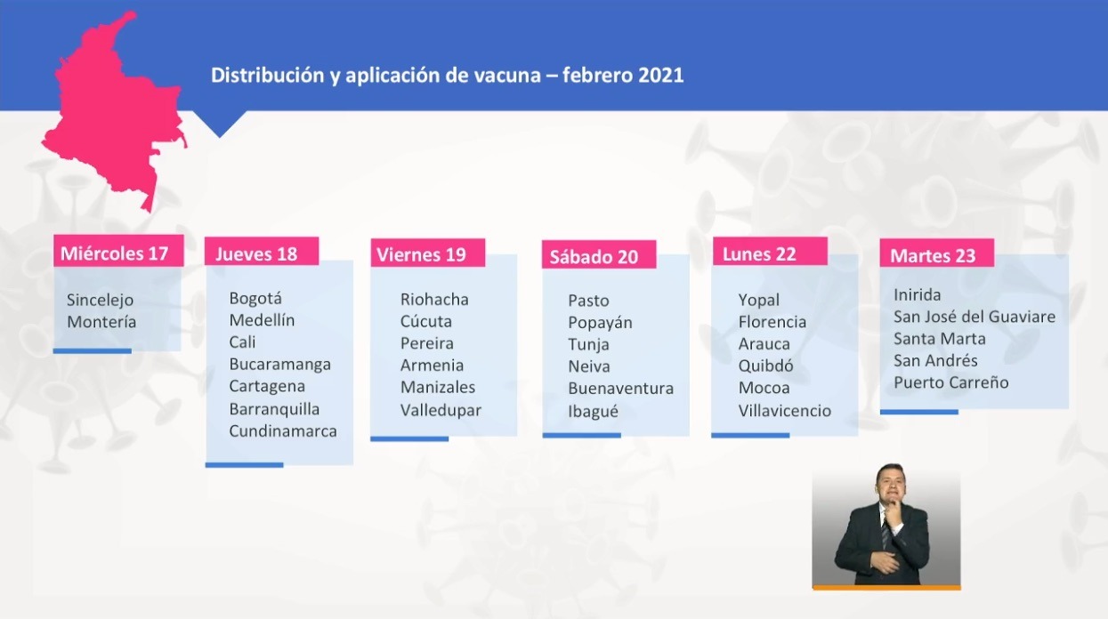Así mismo, el ministro de Salud, Fernando Ruíz, indicó que Sincelejo y Montería son las ciudades donde se empezará este trabajo de vacunación contra el coronavirus en la fecha señalada. De esta manera, durante los siguientes días el cronograma continuará en otras regiones: