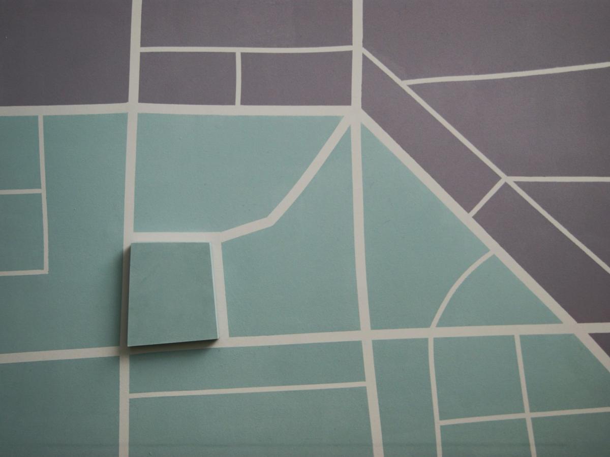 Área es una pintura expandida por toda la sala que juega con el color, las formas 3D y figuras geométricas de planos y cartografías, en un concepto del topos que genera esa interacción con el público.