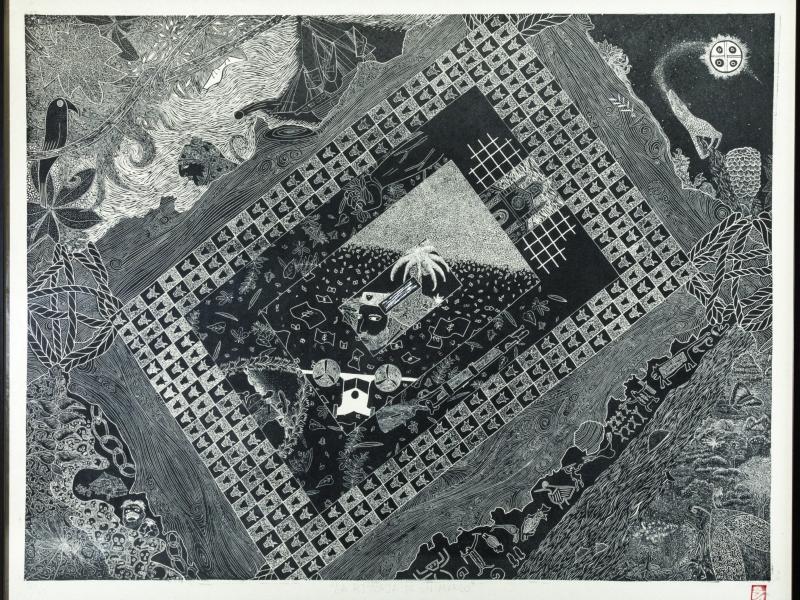 “Para nosotros es todo un placer poder participar de este espacio y un honor poder representar al Caquetá. En mi caso estoy participando con una obra que se llama ´La Historia de un Marco´, es una xilografía de cocaína sobre tela de dos metros por uno y medio, la cual relata y cuenta una historia de 20 mil años de presencia humana en la región (Caquetá), y que alcanza a recoger gran parte de los cimientos de Colombia como nación. Creo que de una u otra forma enmarca gran parte de los conflictos y las tensiones que existen entre el centro y la periferia (…) con la inclusión de la Amazonía como una región botín, una región que es saqueada por quien la controla y que es tenida y valorada por la posibilidad de expoliar su riqueza y de aprovechar lo que en ella habita; y cómo esto hoy en día nos pone en una encrucijada no solamente biológica, climática, sino también civilizatoria y espiritual en torno a cuál es el papel del humano en la Amazonía, y cómo esto entra a permitir o a clausurar otros destinos y otros futuros”, explica Juan Descans, artista visual amazónico y politólogo.