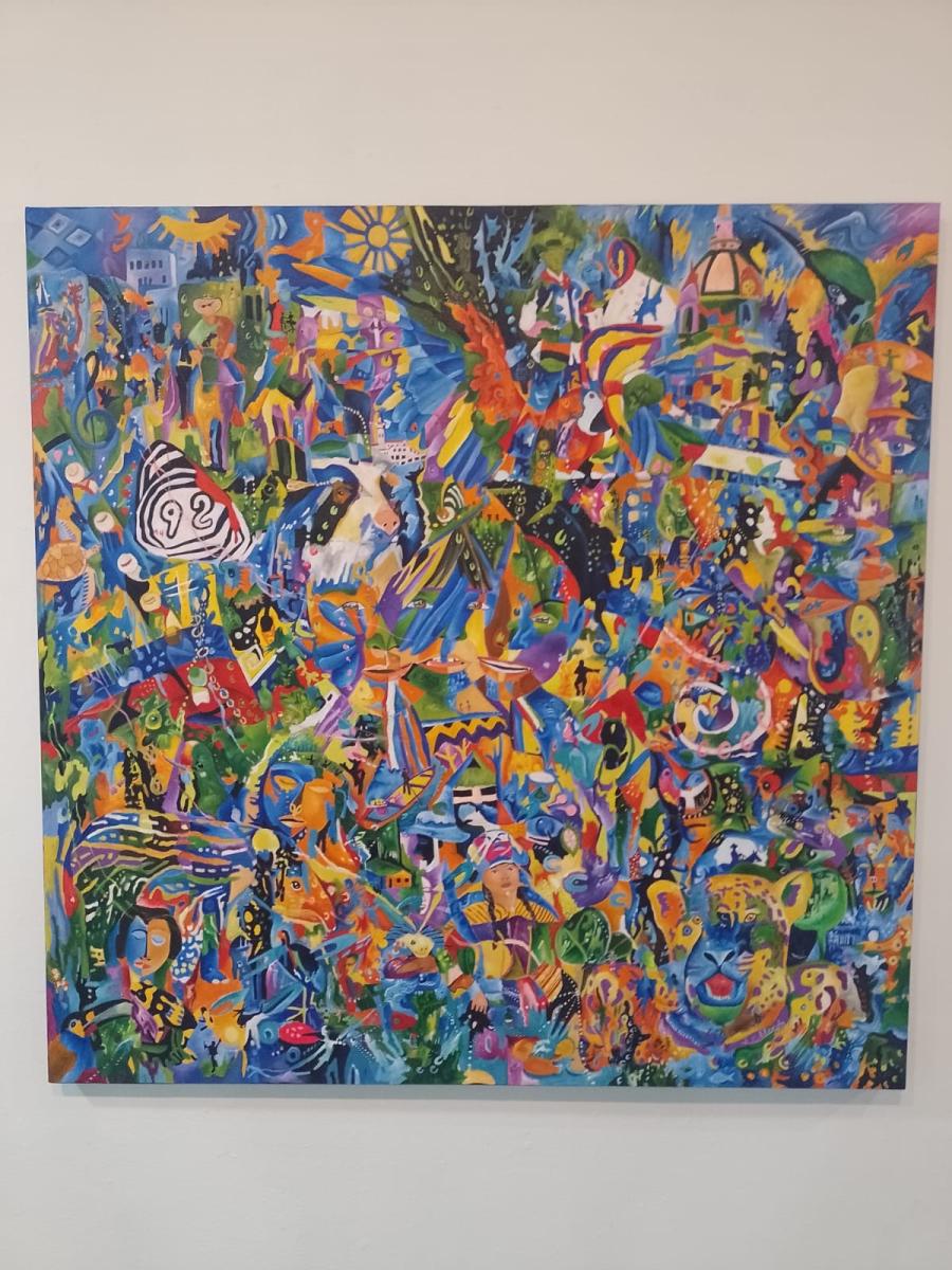 “La idea con la obra ´A Nuestra Tierra´, expuesta en Bogotá, es que el hombre, la mujer, el niño, la niña que se acerque le llame la atención la viveza de sus colores y la alegría que irradia la misma obra, que se vea metido o metida allá mismo en la obra, en ese mundo de color y que también se asombre y sienta que es colombiano y que hay mucha alegría, desborde de muchas cosas hermosas en esta tierra colombiana. De norte a sur, de oriente a occidente, lo que se puede ver, evidenciar son colores vivos de alegría, de entusiasmo, de gente trabajadora, de gente que quiere lo mejor, de gente que quiere la paz”, Alexander Calderón Palacios, artista y docente de la Institución Educativa Instituto Técnico Comercial Sagrados Corazones de Puerto Rico, municipio donde tiene una sala de exposición constante en su casa ubicada en el Barrio de las Américas, con obras que van desde la pintura al óleo sobre lienzo y esculturas con madera recuperada y madera de deriva.