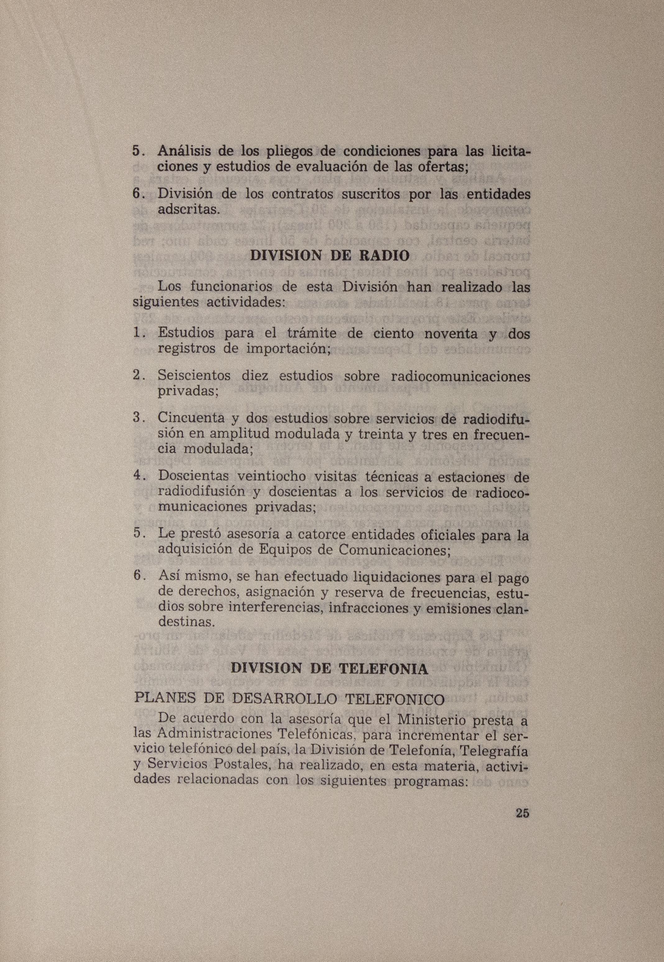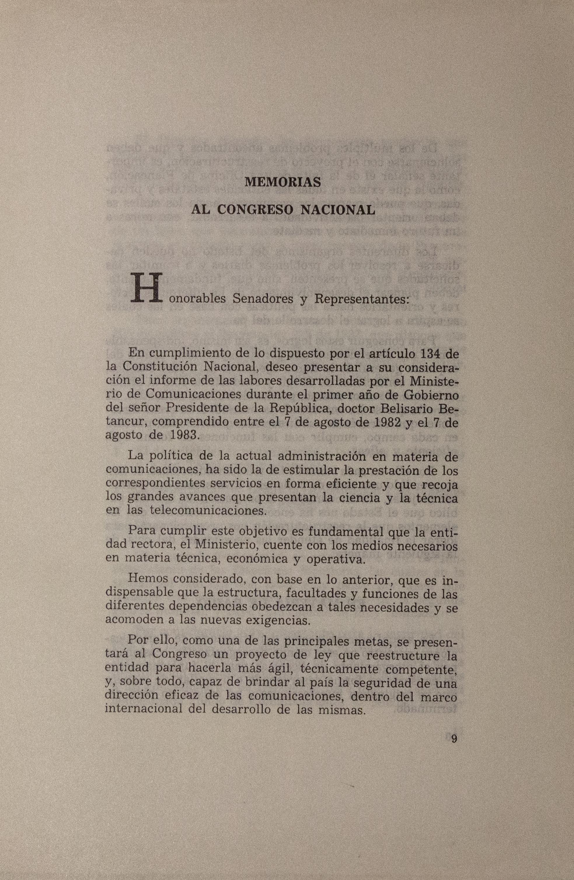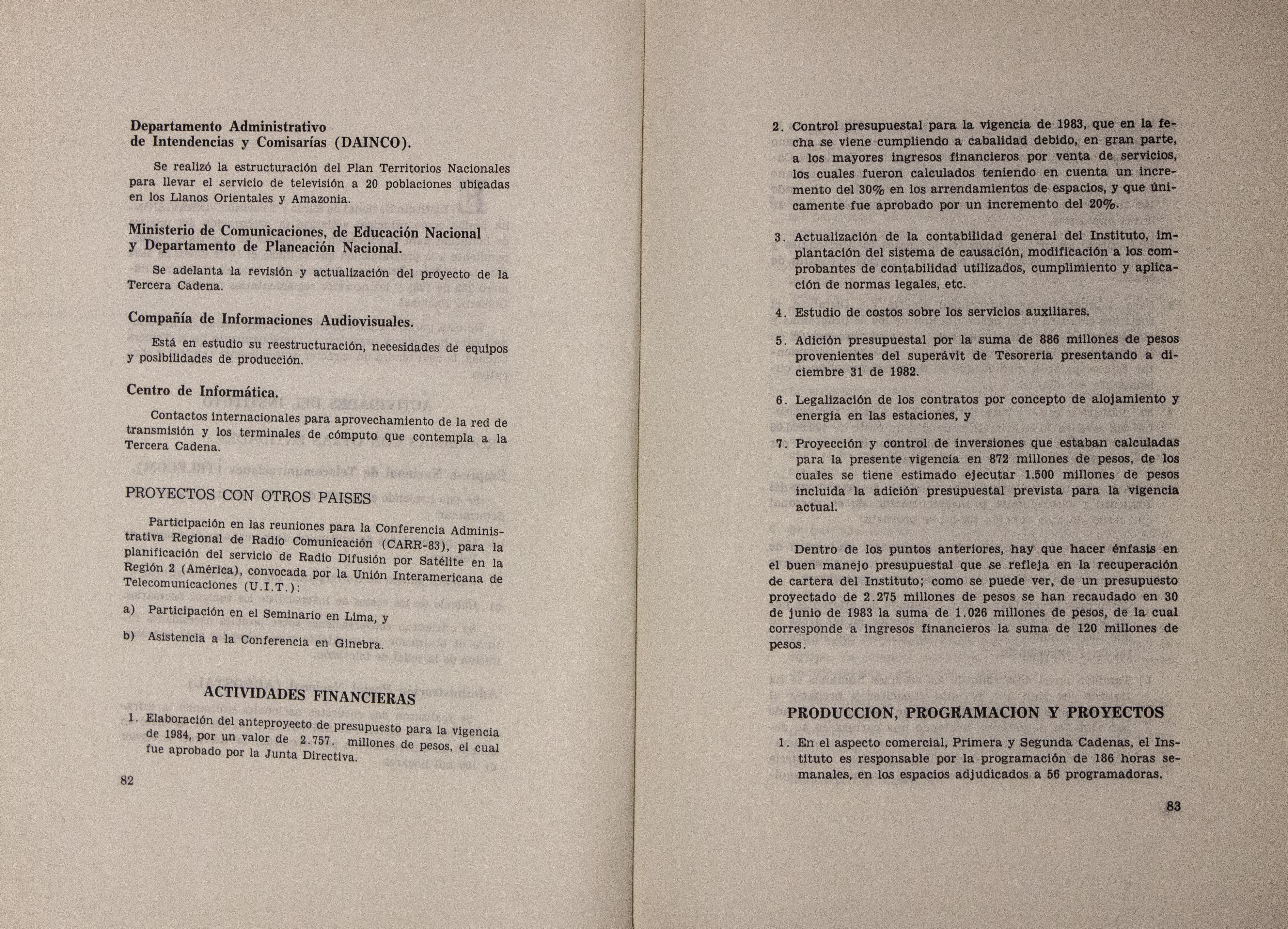 "Informe de 1982 y 1983, entregado por el Ministro de Comunicaciones Bernardo Ramírez R. al Congreso de la República. Presenta las actividades realizadas por la División de radio del Ministerio, centradas en otorgar licencias, dar asistencia de tipo técnico a entidades públicas y privadas, tramitar pagos de derechos, reservas de frecuencias, entre otros. Incluye un aparte del Instituto Nacional del Radio y Televisión en el que expone las actividades que éste llevó a cabo con otras entidades como Telecom, Adpostal y Daínco. Da cuenta de las actividades financieras haciendo énfasis en la superación de la cifra de recaudos prevista para ese periodo. En relación con la producción, programación y proyectos presenta información sobre la primera y segunda cadena. Menciona los tipos de programas de televisión que produce, en asocio con instituciones como Colcultura. Menciona avances en la configuración del equipo de profesionales del Instituto, así como los estudios de audiencias dirigidos a mejorar la programación. Indica que se estudia la conformación de un tercer canal educativo. Explica los planes de mejoramiento técnico para alcanzar mayor cobertura nacional.