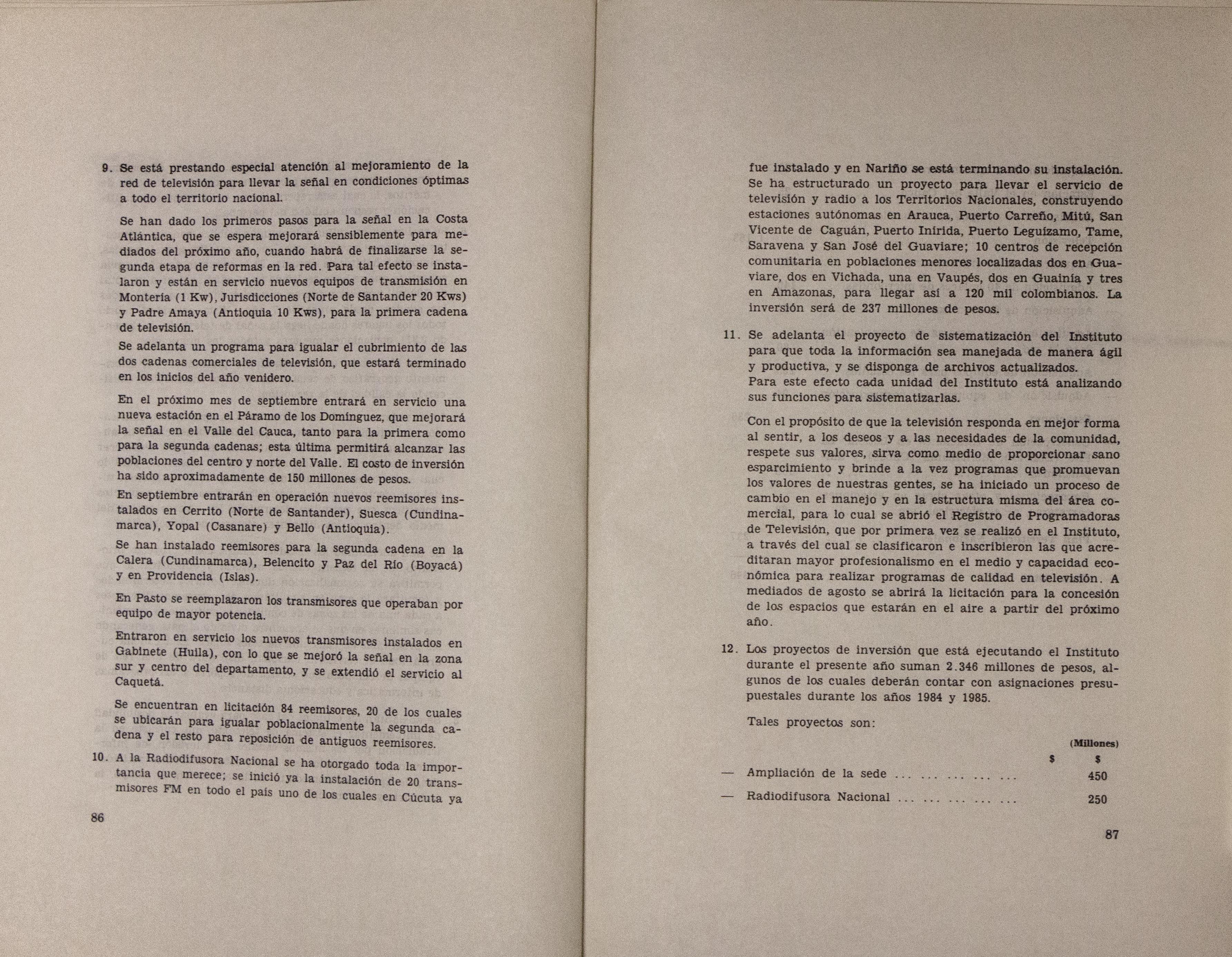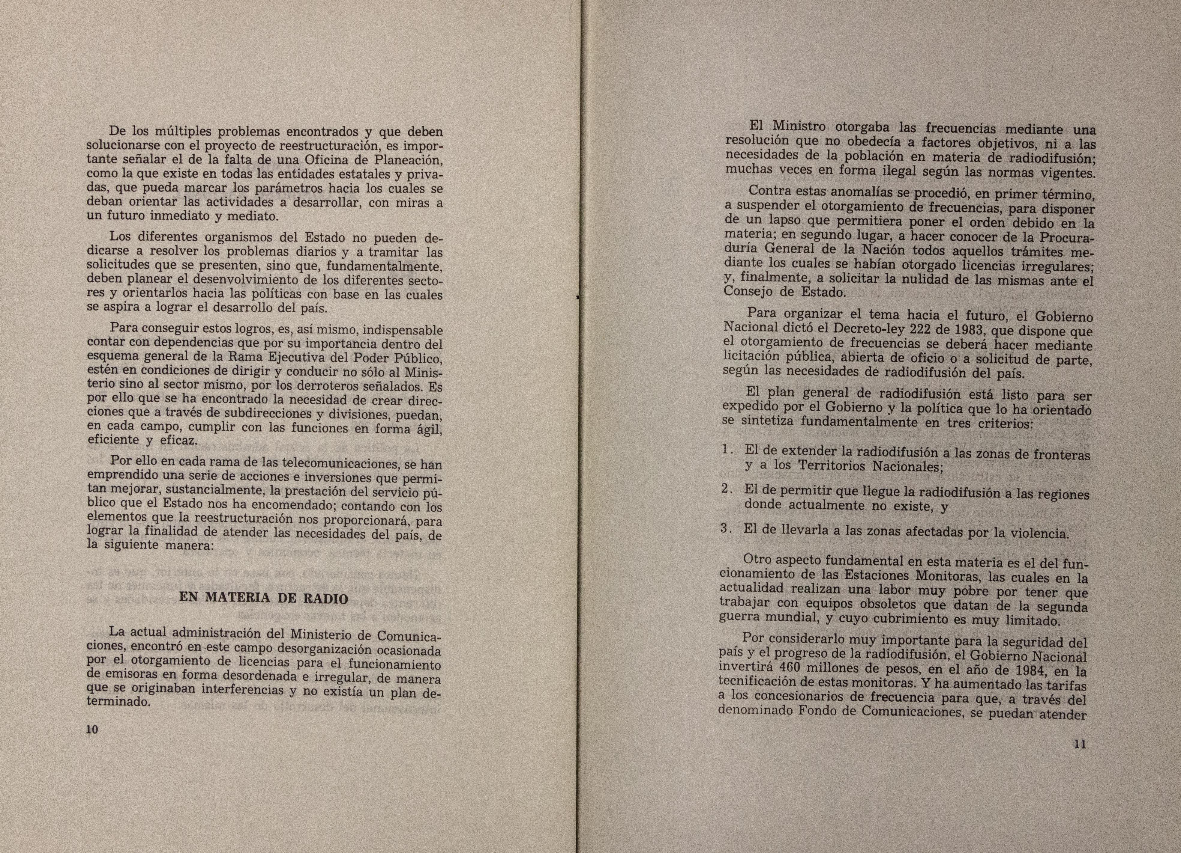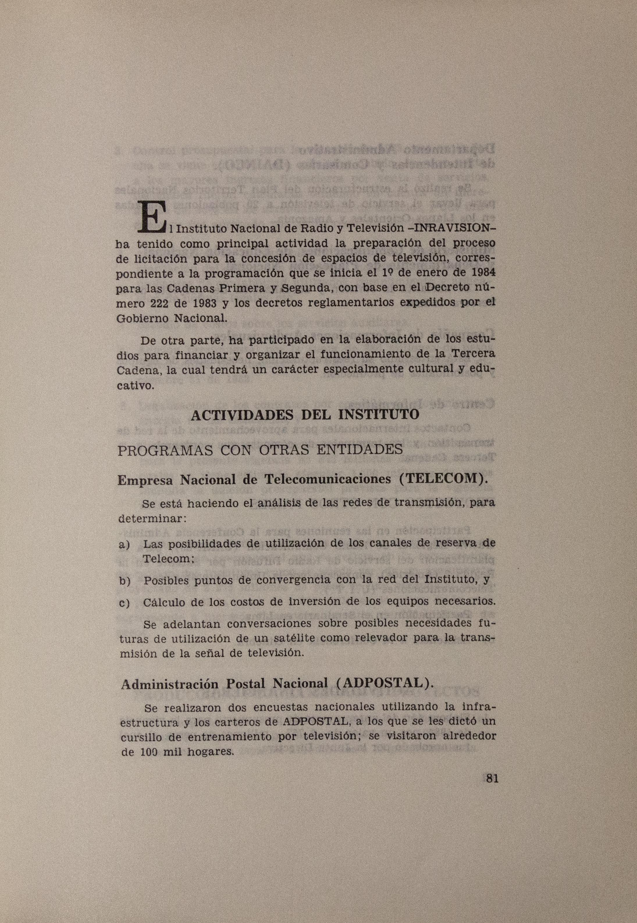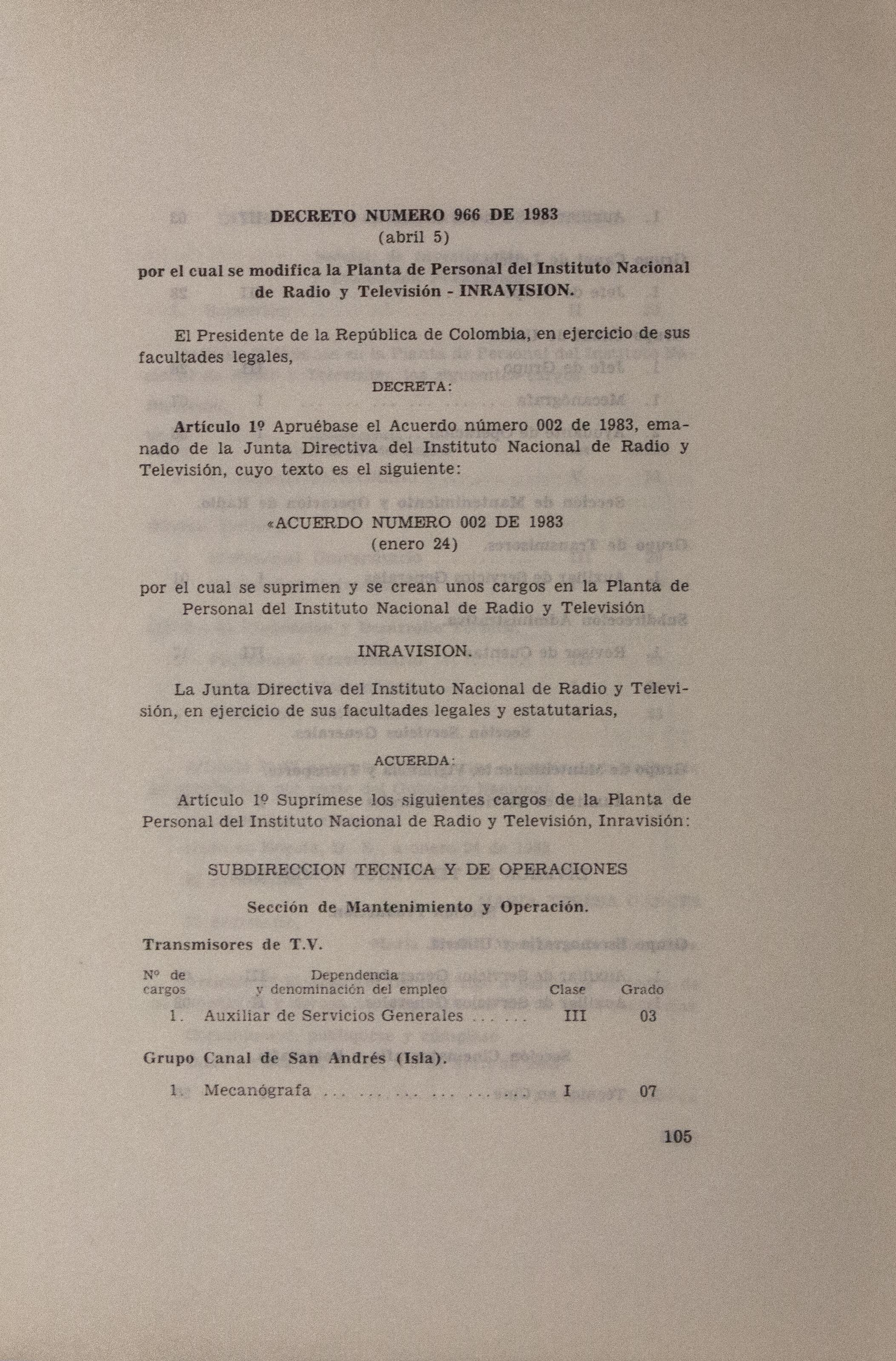 Sobre la Radio Nacional de Colombia se indica la instalación de transmisores FM en distintos puntos del territorio nacional. Se señalan aspectos sobre el mejoramiento de Inravisión como la sistematización de la información y los gastos e inversión. Se incluyen varios decretos y leyes: a) Decreto 966 de 1983, que modifica la Planta de Inravisión; firmado por el presidente de la República Belisario Betancourt y el Ministro de Comunicaciones Bernardo Ramírez R; sustenta con tablas los cambios de la planta desde el punto de vista presupuestal. b) Ley 57 de 1982, que especifica cuáles serán los derechos salariales de los trabajadores. c) Decreto 2916 de 1982 que fija derechos de pago de radiocomunicaciones, según tipos de frecuencias y otros criterios como derechos de funcionamiento de emisoras de distinta naturaleza (cultural, comercial, educativa) y en sistemas AM, FM, onda corta, onda larga; d) Decreto 1131 de 1983 que reglamenta la expedición de licencias de radio y televisión que acreditan la calidad de actor o director. El decreto mencionan los requisitos para ser actor y director de radioteatro y los titulos académicos o equivalencias de los mismos. Para este último aspecto se crea la Junta de Calificación Artística. Se mencionan algunas necesidades relacionadas con la radio en Colombia: suspender frecuencias sin licencia, otorgar licencias de manera ordenada, ampliar la cobertura, llevar el medio a zonas afectadas por la violencia, entre otros."