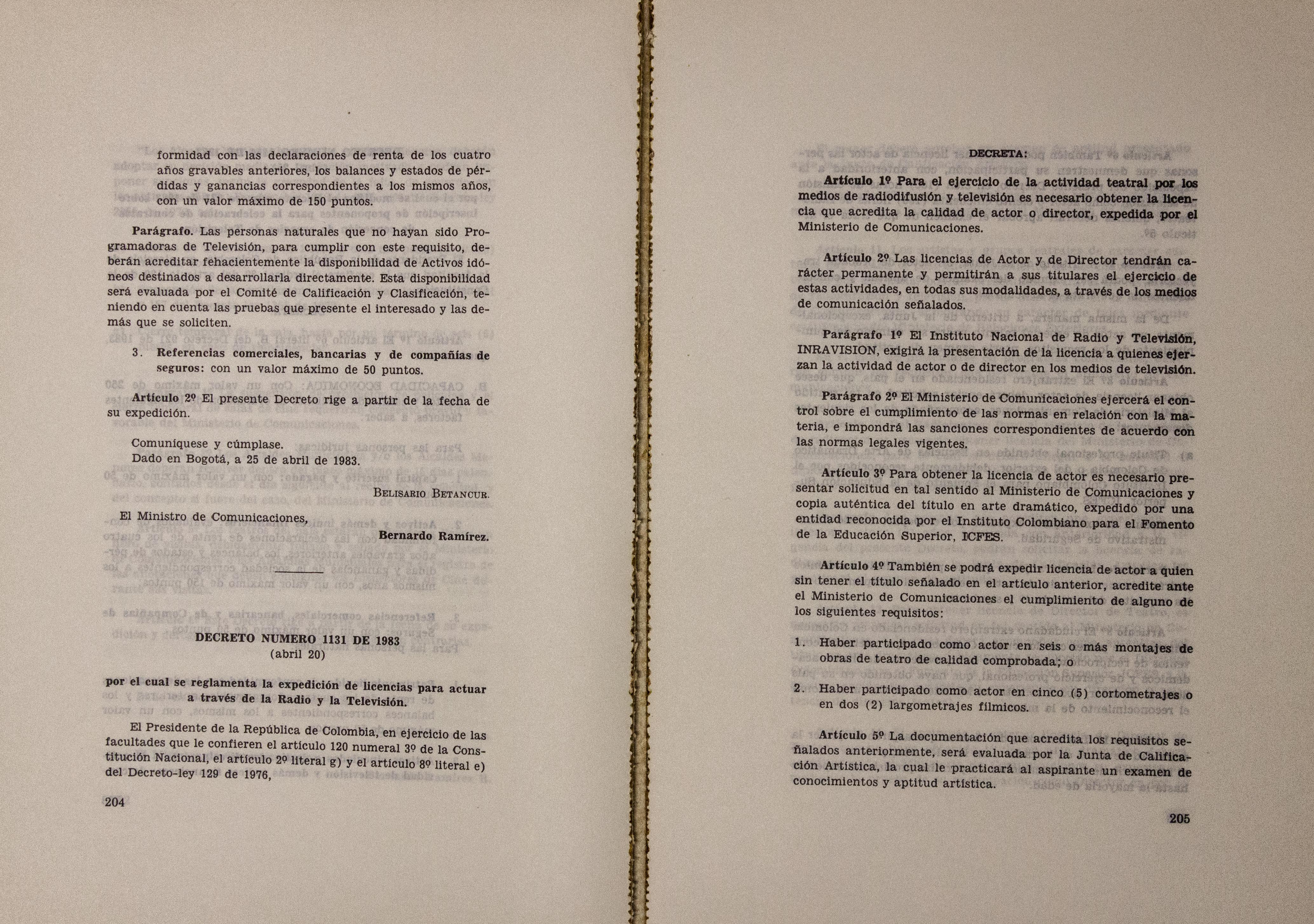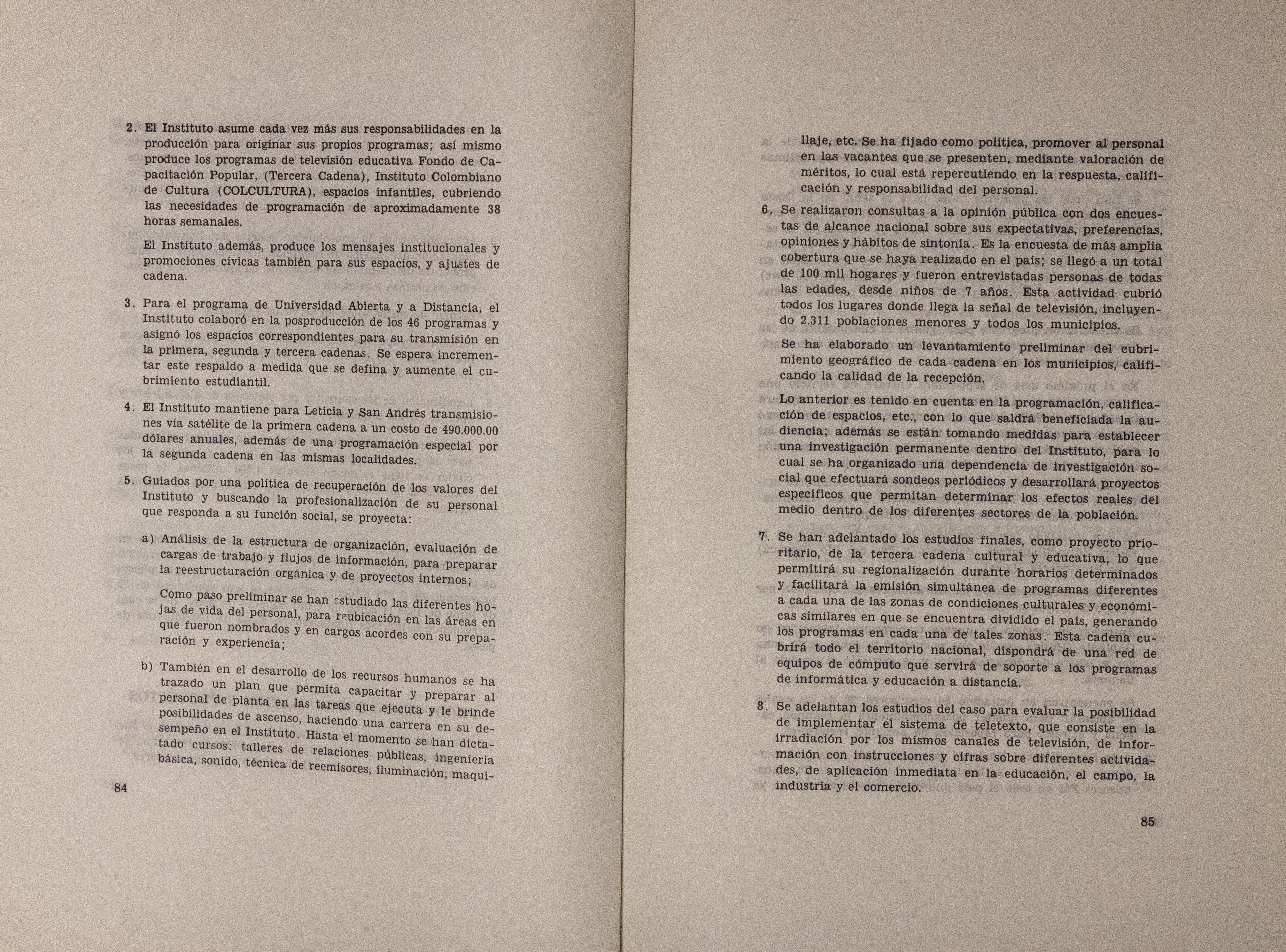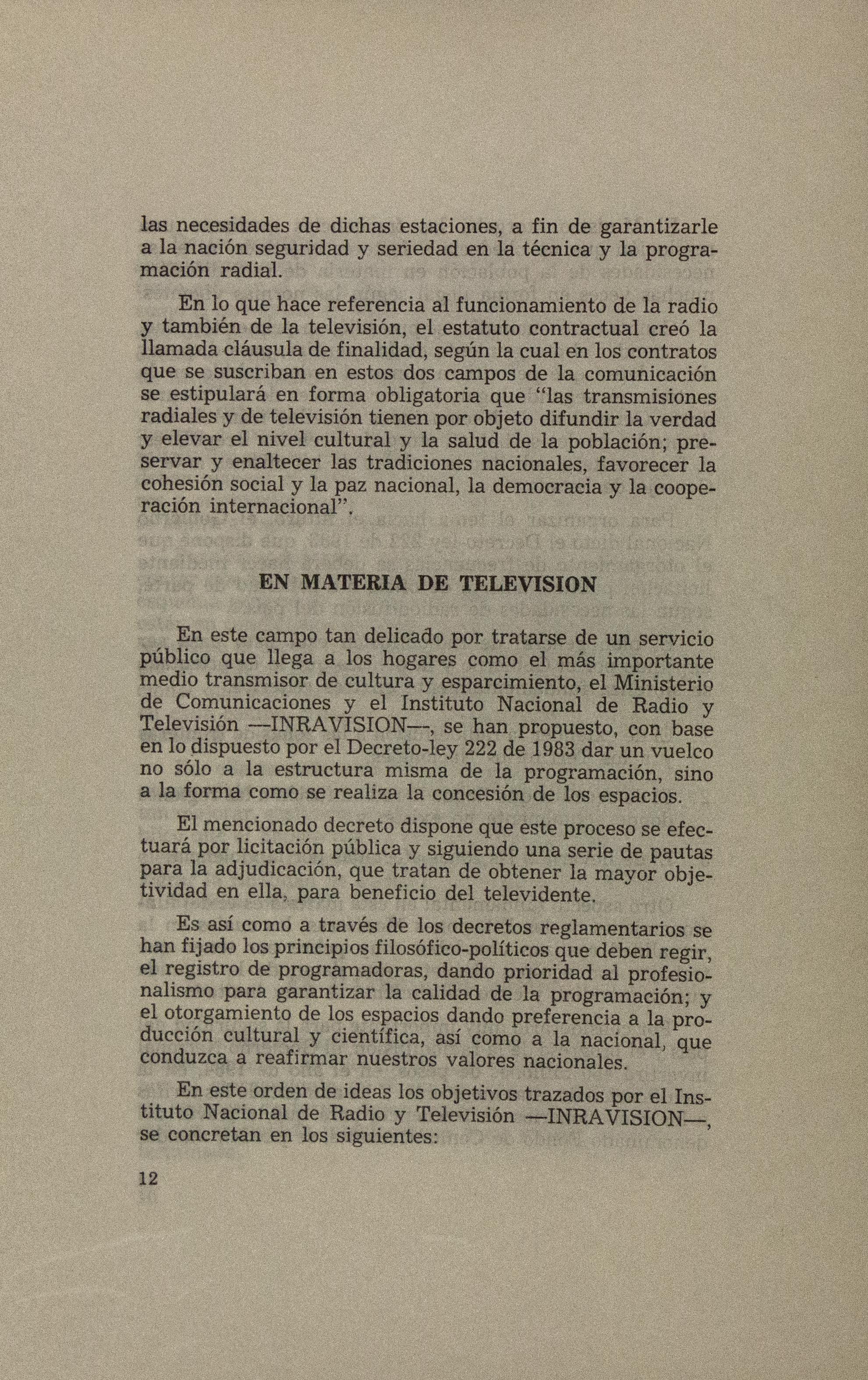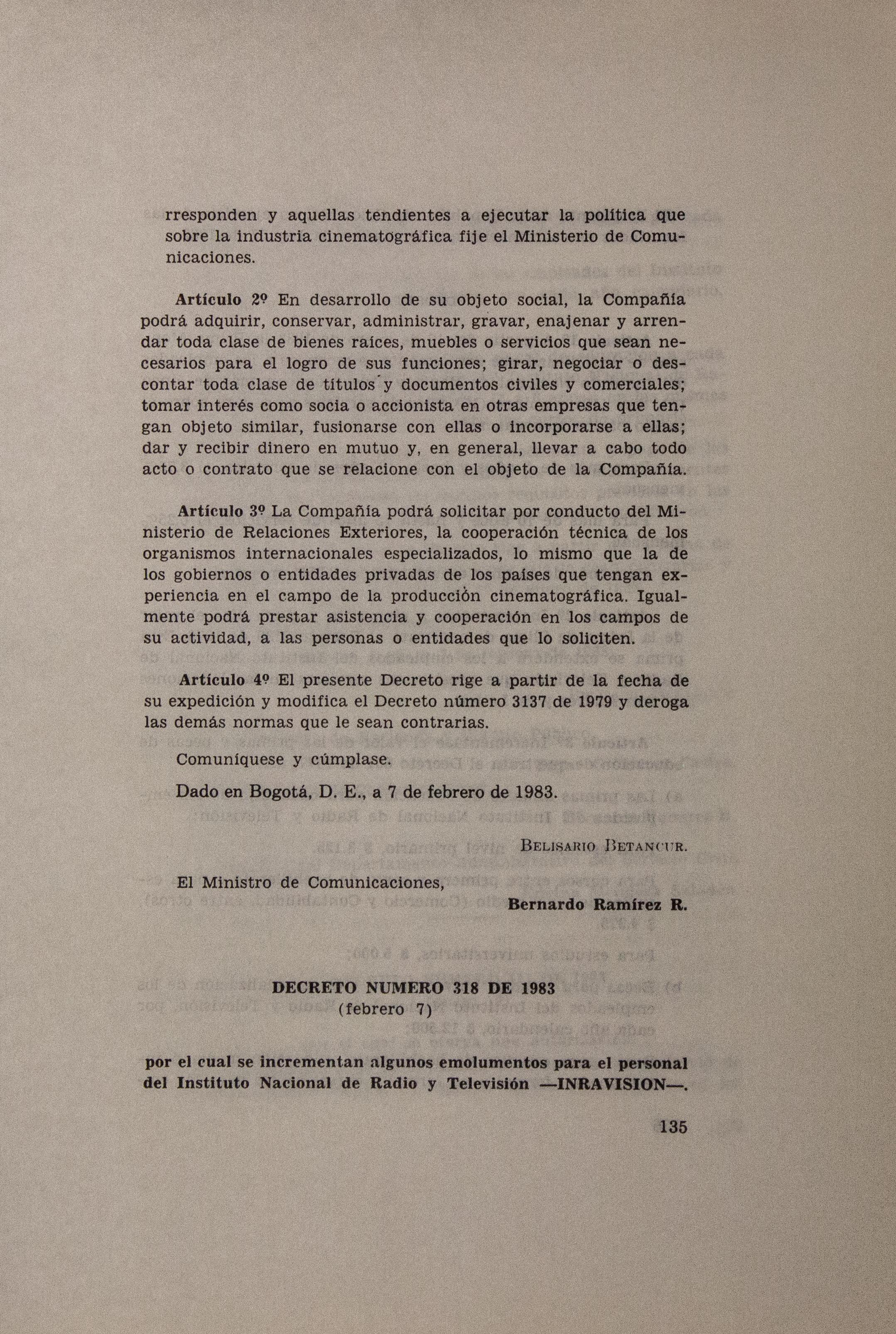 Sobre la Radio Nacional de Colombia se indica la instalación de transmisores FM en distintos puntos del territorio nacional. Se señalan aspectos sobre el mejoramiento de Inravisión como la sistematización de la información y los gastos e inversión. Se incluyen varios decretos y leyes: a) Decreto 966 de 1983, que modifica la Planta de Inravisión; firmado por el presidente de la República Belisario Betancourt y el Ministro de Comunicaciones Bernardo Ramírez R; sustenta con tablas los cambios de la planta desde el punto de vista presupuestal. b) Ley 57 de 1982, que especifica cuáles serán los derechos salariales de los trabajadores. c) Decreto 2916 de 1982 que fija derechos de pago de radiocomunicaciones, según tipos de frecuencias y otros criterios como derechos de funcionamiento de emisoras de distinta naturaleza (cultural, comercial, educativa) y en sistemas AM, FM, onda corta, onda larga; d) Decreto 1131 de 1983 que reglamenta la expedición de licencias de radio y televisión que acreditan la calidad de actor o director. El decreto mencionan los requisitos para ser actor y director de radioteatro y los titulos académicos o equivalencias de los mismos. Para este último aspecto se crea la Junta de Calificación Artística. Se mencionan algunas necesidades relacionadas con la radio en Colombia: suspender frecuencias sin licencia, otorgar licencias de manera ordenada, ampliar la cobertura, llevar el medio a zonas afectadas por la violencia, entre otros."