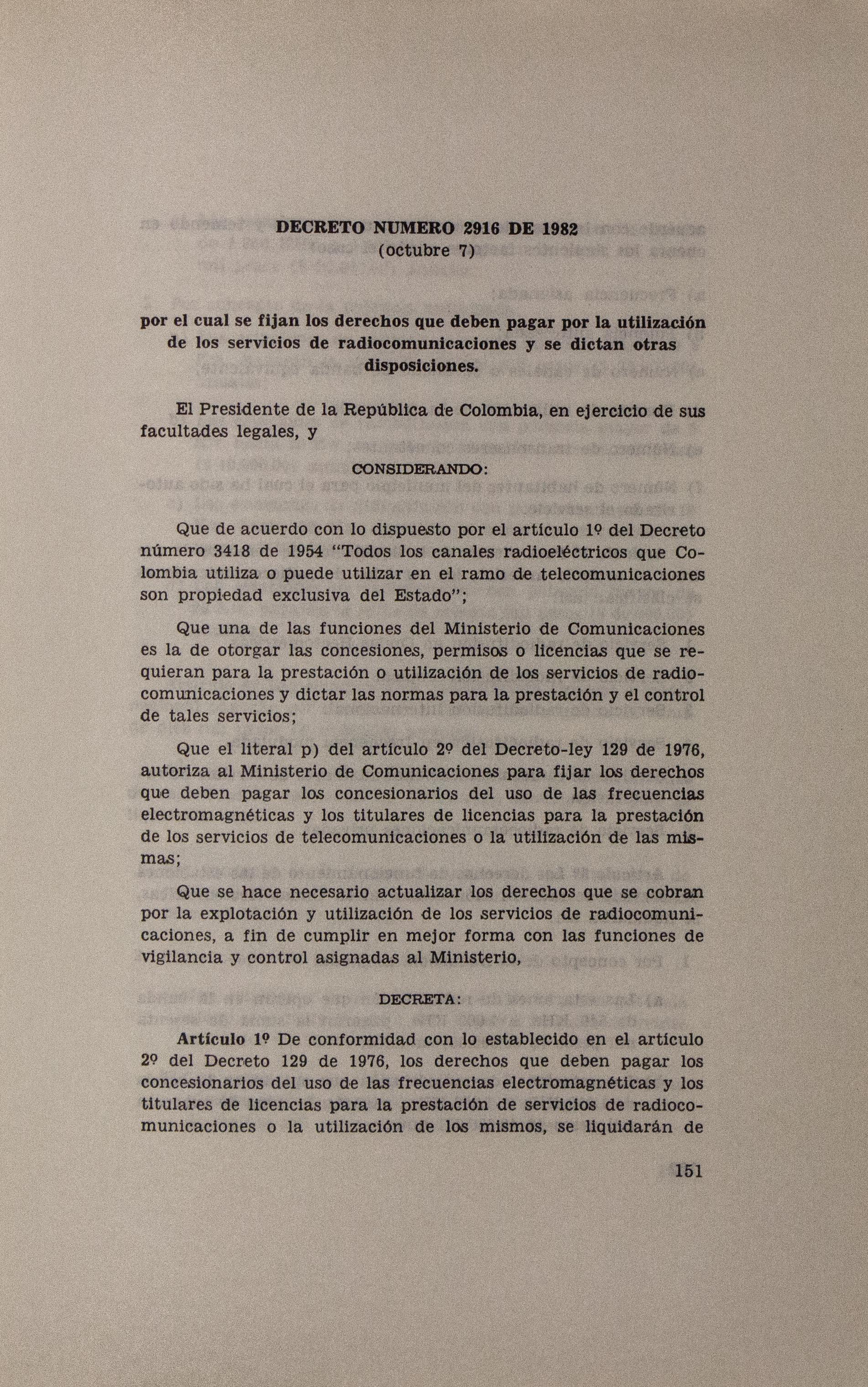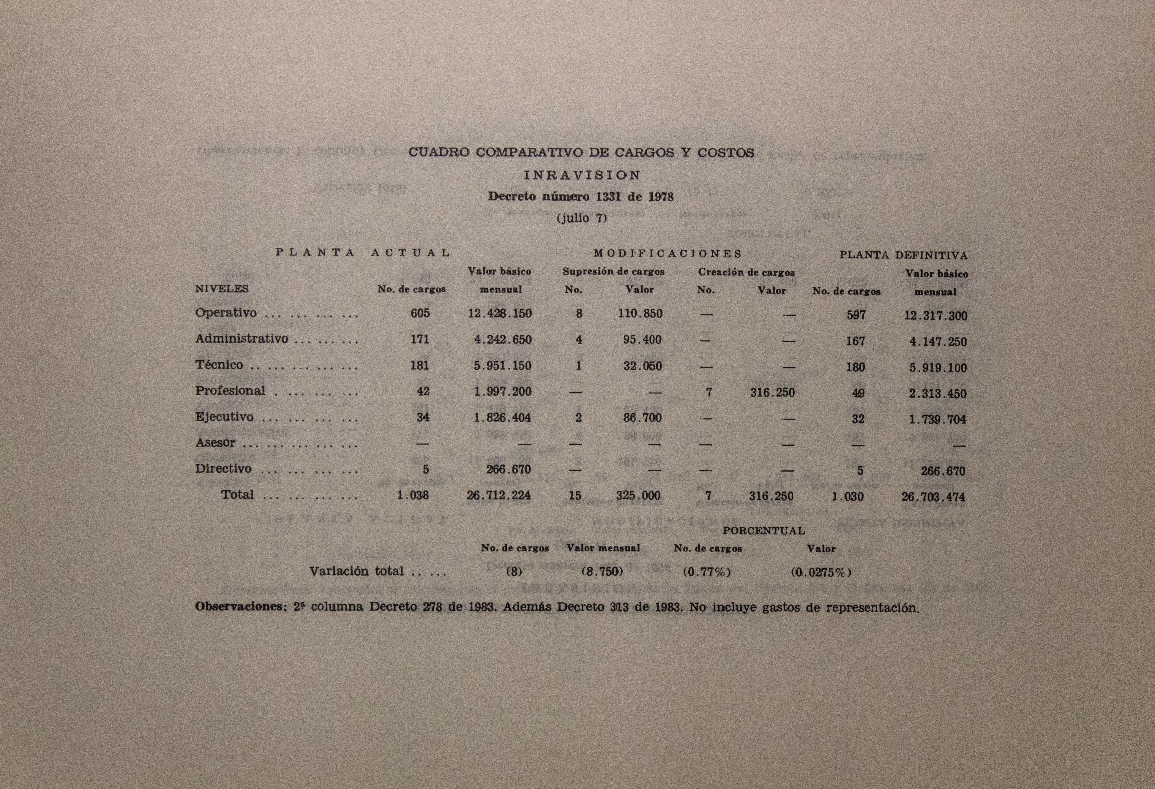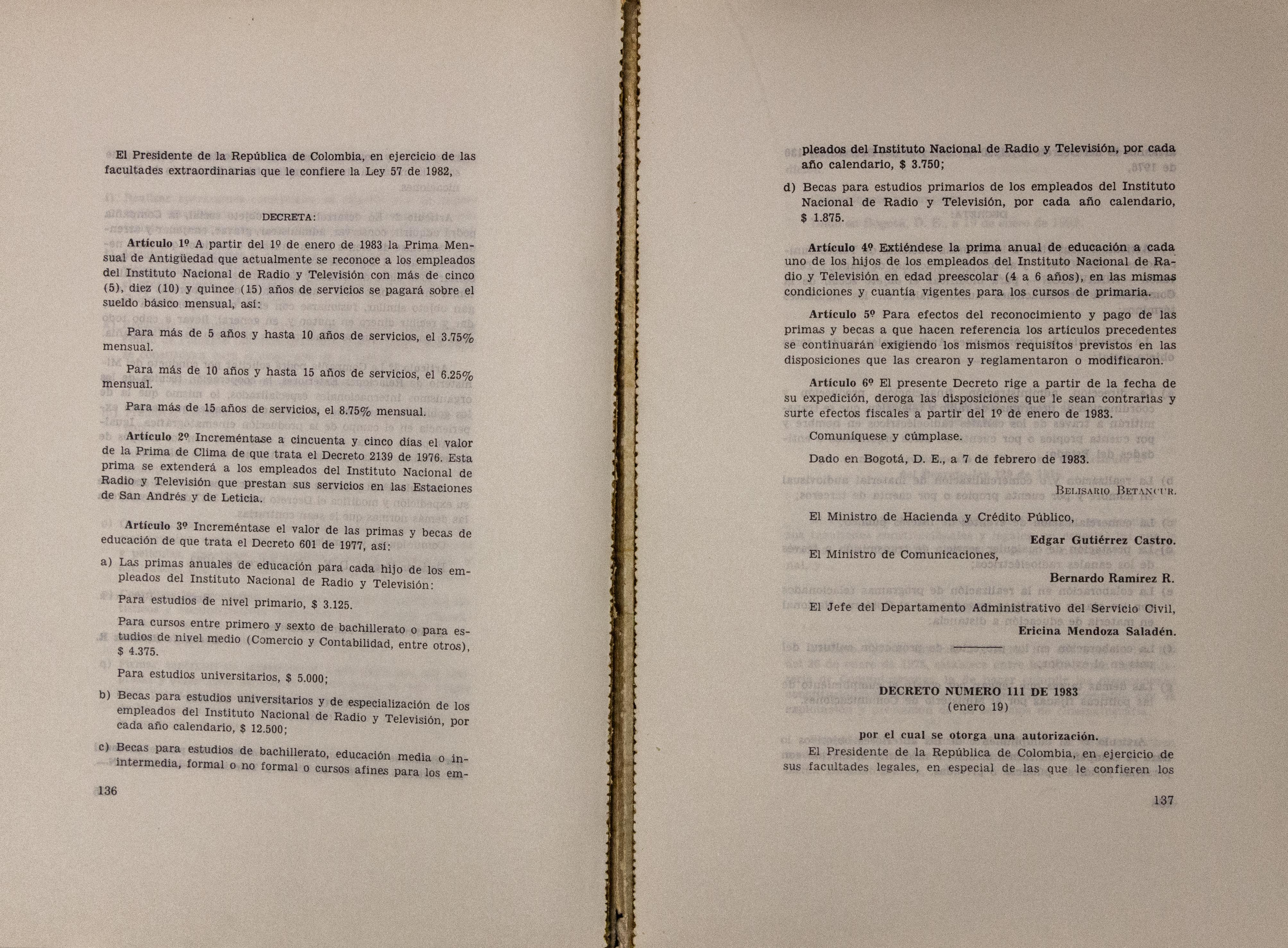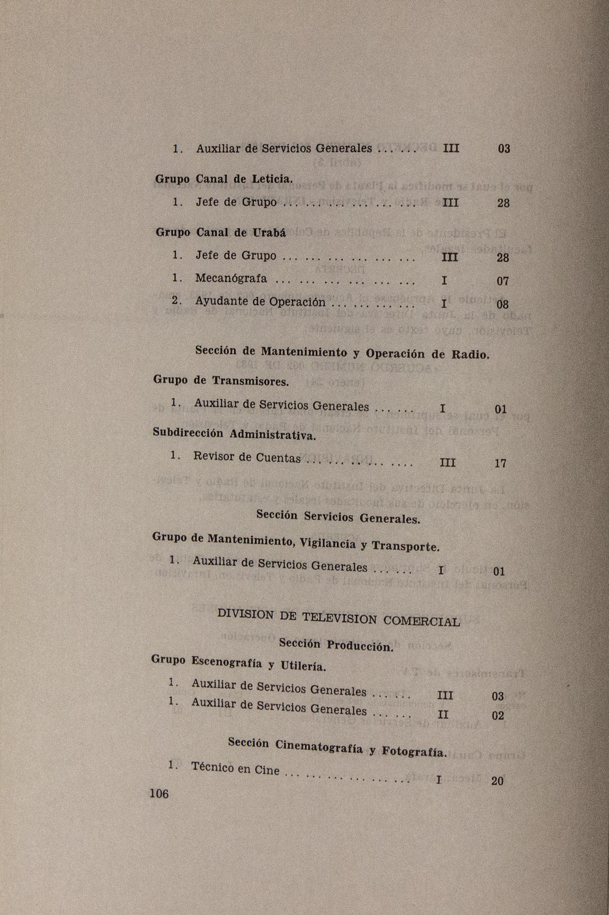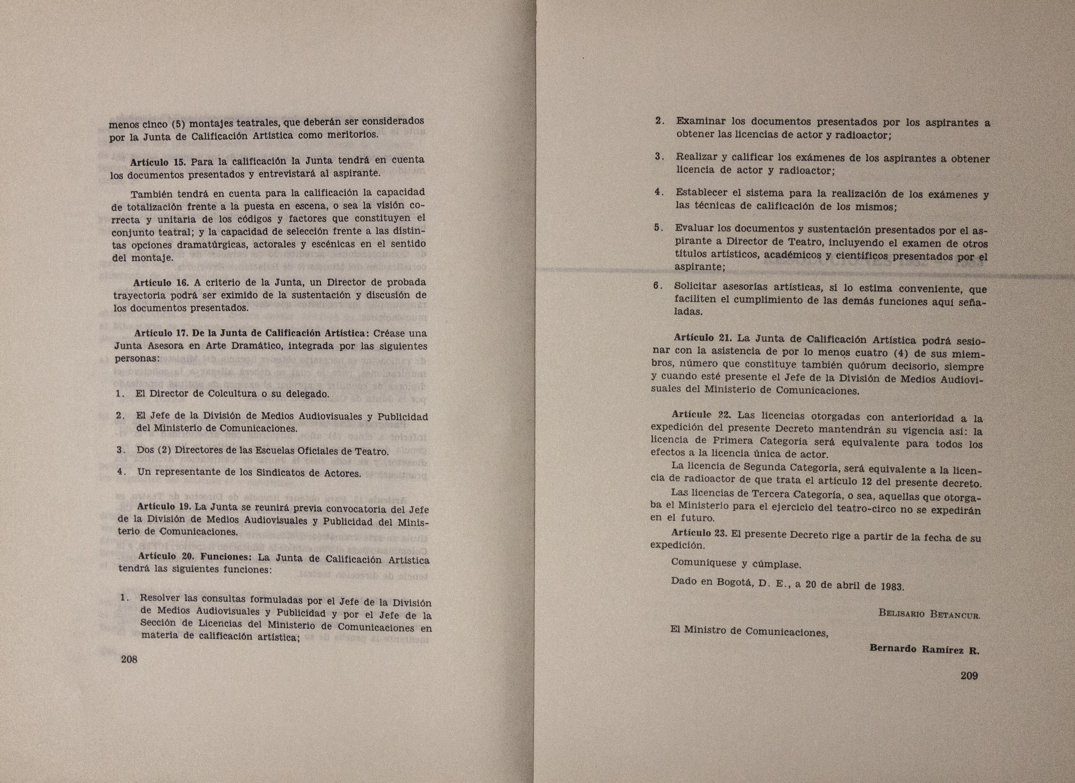 Sobre la Radio Nacional de Colombia se indica la instalación de transmisores FM en distintos puntos del territorio nacional. Se señalan aspectos sobre el mejoramiento de Inravisión como la sistematización de la información y los gastos e inversión. Se incluyen varios decretos y leyes: a) Decreto 966 de 1983, que modifica la Planta de Inravisión; firmado por el presidente de la República Belisario Betancourt y el Ministro de Comunicaciones Bernardo Ramírez R; sustenta con tablas los cambios de la planta desde el punto de vista presupuestal. b) Ley 57 de 1982, que especifica cuáles serán los derechos salariales de los trabajadores. c) Decreto 2916 de 1982 que fija derechos de pago de radiocomunicaciones, según tipos de frecuencias y otros criterios como derechos de funcionamiento de emisoras de distinta naturaleza (cultural, comercial, educativa) y en sistemas AM, FM, onda corta, onda larga; d) Decreto 1131 de 1983 que reglamenta la expedición de licencias de radio y televisión que acreditan la calidad de actor o director. El decreto mencionan los requisitos para ser actor y director de radioteatro y los titulos académicos o equivalencias de los mismos. Para este último aspecto se crea la Junta de Calificación Artística. Se mencionan algunas necesidades relacionadas con la radio en Colombia: suspender frecuencias sin licencia, otorgar licencias de manera ordenada, ampliar la cobertura, llevar el medio a zonas afectadas por la violencia, entre otros."
