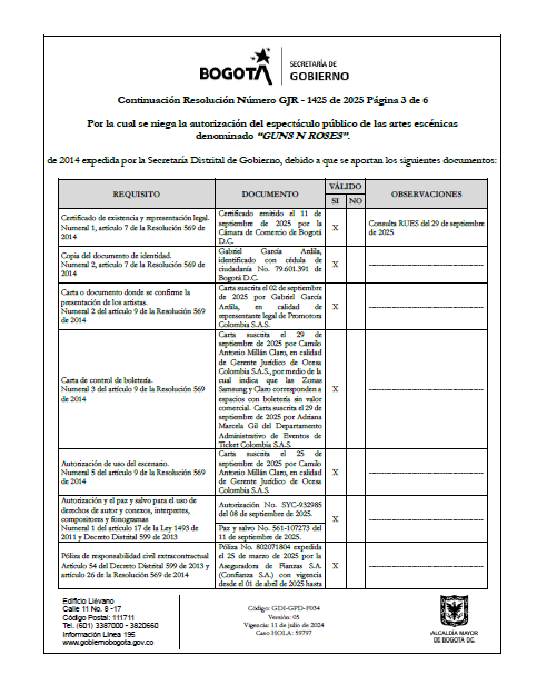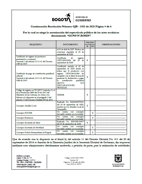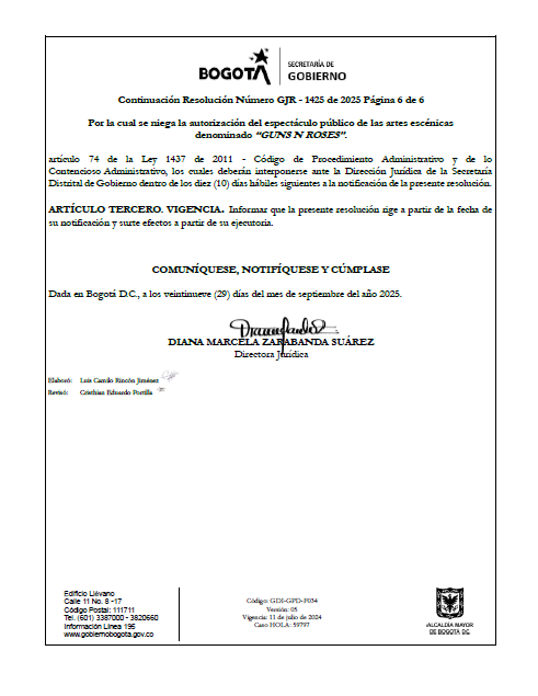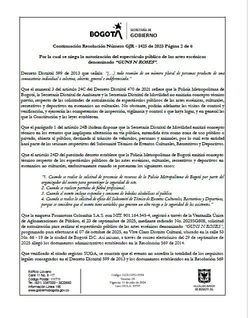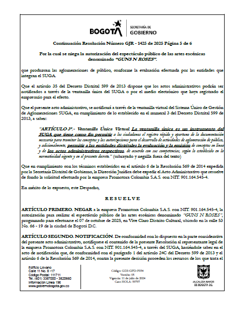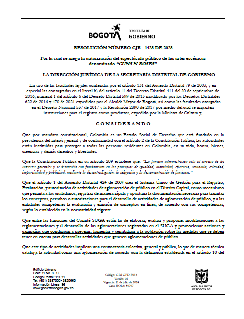 El concierto de Guns N’ Roses en Bogotá programado para el próximo 7 de octubre, no se realizará en primera instancia. La Secretaría Distrital de Gobierno expidió la Resolución 1425 del 29 de septiembre de 2025, en la que niega la autorización del espectáculo previsto en el Vive Claro Distrito Cultural, al no existir concepto favorable de seguridad.