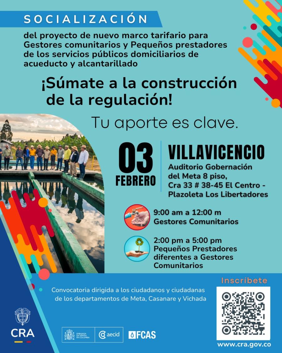 La Comisión de Regulación de Agua Potable y Saneamiento Básico (CRA) realizará el próximo martes 3 de febrero de 2026, en la ciudad de Villavicencio, una jornada de socialización del proyecto de resolución del Nuevo Marco Tarifario de Acueducto y Alcantarillado, dirigida a gestores comunitarios y pequeños prestadores de estos servicios públicos.