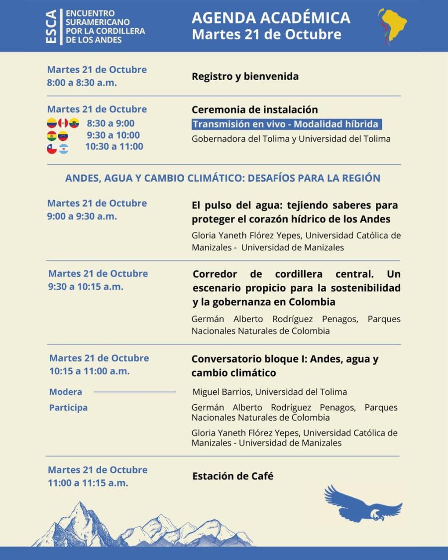 La agenda académica y ambiental se desarrollará los días 21 y 22 de octubre en el Círculo Social de Ibagué, con entrada libre al público, y continuará el 23 y 24 de octubre en Murillo, a los pies del Nevado del Ruiz.