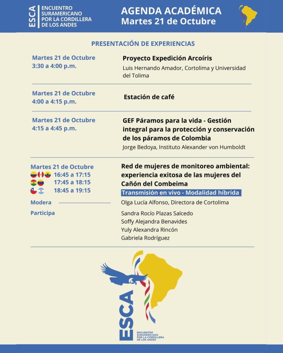 Se presentarán estrategias de adaptación, experiencias locales de conservación —como las de la Red de Mujeres del Cañón del Combeima, Acuatol y organizaciones ambientales del norte del Tolima—, así como paneles sobre educación ambiental y gobernanza comunitaria.
