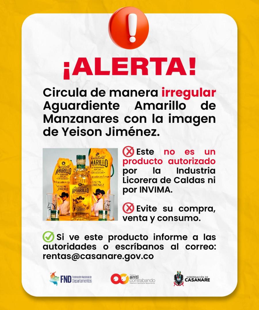 Las autoridades del departamento de Casanare emitieron una alerta a la ciudadanía ante la comercialización ilegal de Aguardiente Amarillo que utiliza la imagen del cantante Yeison Jiménez, producto que no cuenta con la autorización de la Industria Licorera de Caldas ni con el registro sanitario del Instituto Nacional de Vigilancia de Medicamentos y Alimentos (INVIMA).